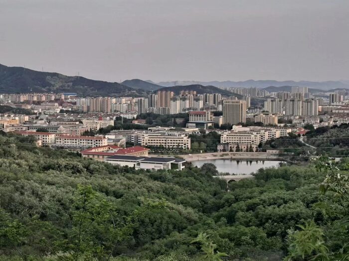 Вид на универ и часть города с ближайшей горы. Большую часть универа занимают общежития китайских студентов. Неудивительно, их здесь 30-40к.