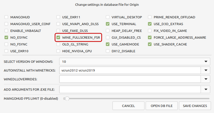 1. Заходим в Lutris -> правой кнопкой мышки по ярлыку игры -> настройки -> параметры раннера -> активируем FSR -> сохранить