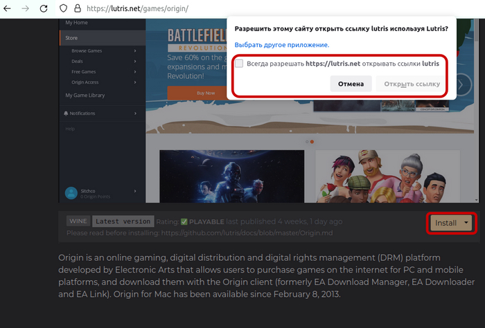 3. На странице игры есть кнопка "Install" вот ее и нужно нажать. Происходит запрос на разрешение открытия "Lutris" (разумеется он должен быть установлен), подтверждаете нажатием на "открыть ссылку".