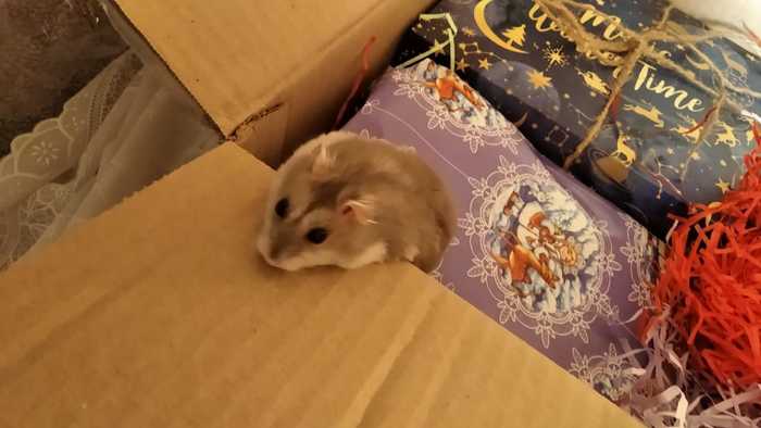 Но адресованная мне посылка - это чудо. Мало того, что каждый подарок запакован отдельно – так даже коробка обклеена в праздничную упаковку. Хомякоинспекция недавно у нас ушла на Радугу, поэтому инспектирует старый, проверенный в боях и походах медвежонок.