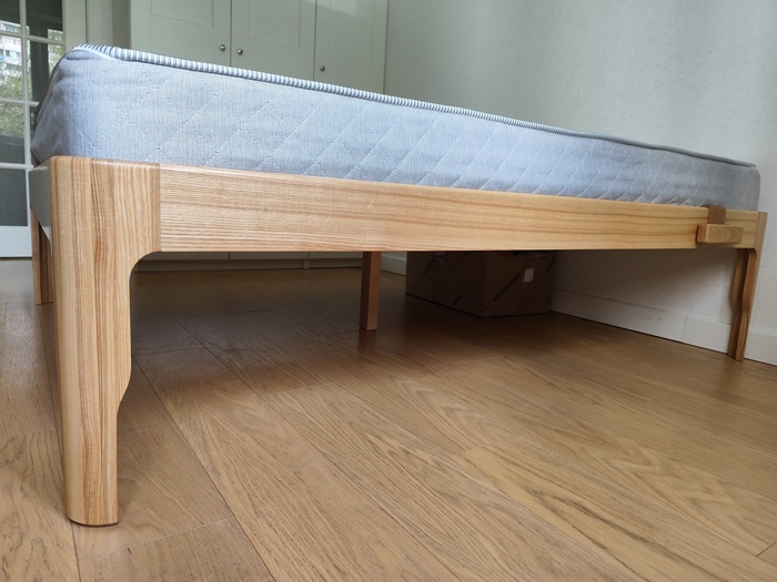 Короткие царги склеены с ножками на двойной шип-гнездо, длинные царги притянуты кроватными эксцентриковыми стяжками (по две на каждое соединение) с дополнительным вставным шипом. То есть кровать разборная.