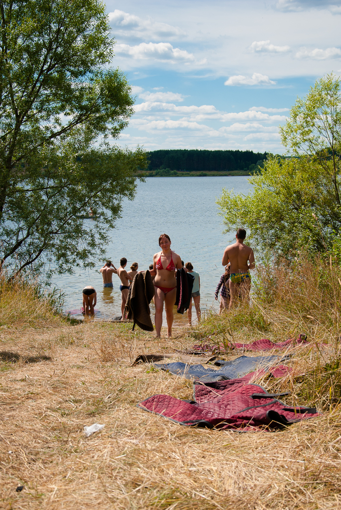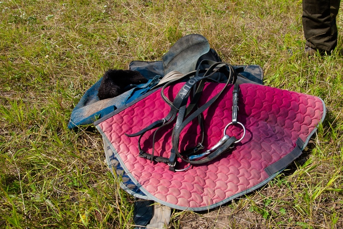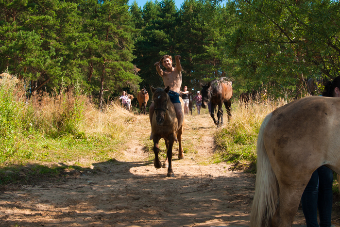 Через пару часов прибываем на границу воды и соснового леса. Запахи одуряющие, воздух аж искрится кислородом и нам можно купаться. Но сначала коней раздеть, почистить, накормить, раздать овса, погулять, напоить... Седла притащить на место дислокации, попоны почистить, ибо кони потеют как кони))