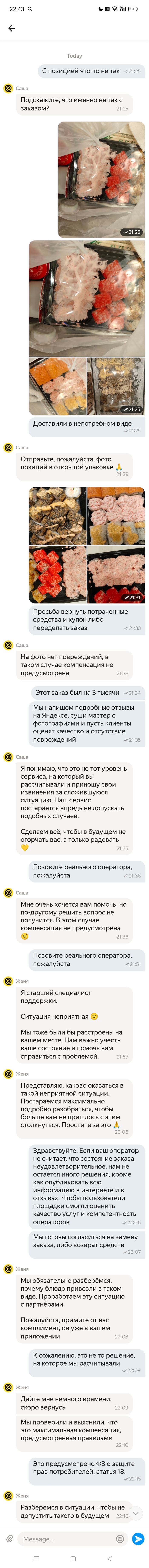 Для ЛЛ: заказали роллы на ~3к рублей. Пришли раздавленные. Попросили оператора заменить заказ, либо вернуть средства, но он посчитал, что "недостатки отсутствуют".