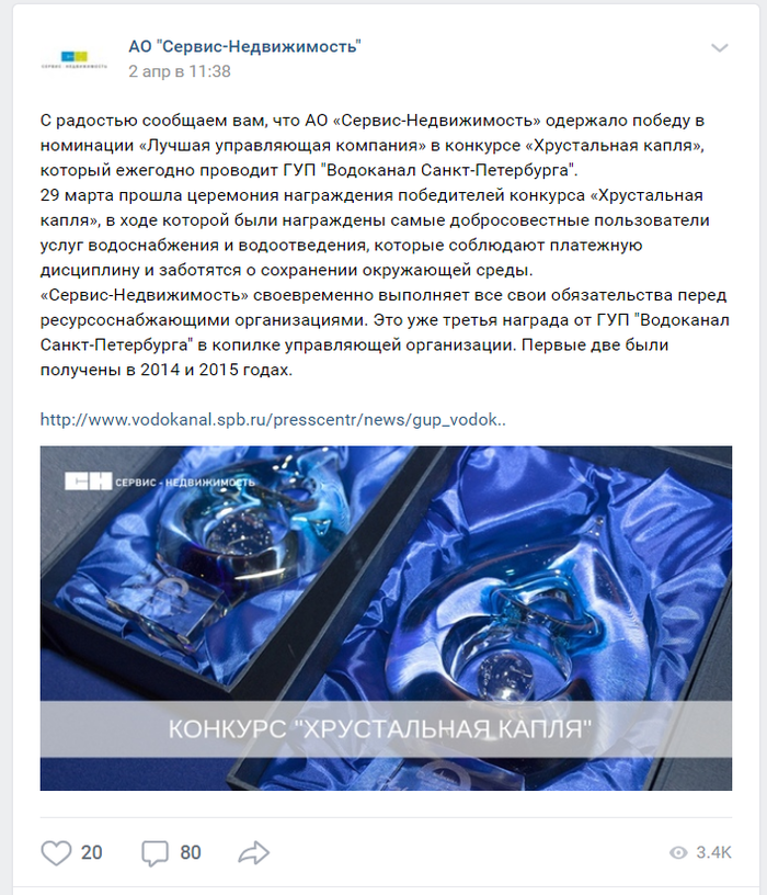 29 марта прошла церемония награждения победителей конкурса «Хрустальная капля», в ходе которой филиал ГУП «Водоканал Санкт-Петербурга» «Единый расчетный центр» наградил самых добросовестных пользователей услуг водоснабжения и водоотведения, которые соблюдают платежную дисциплину и заботятся о сохранении окружающей среды.