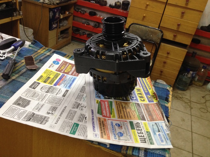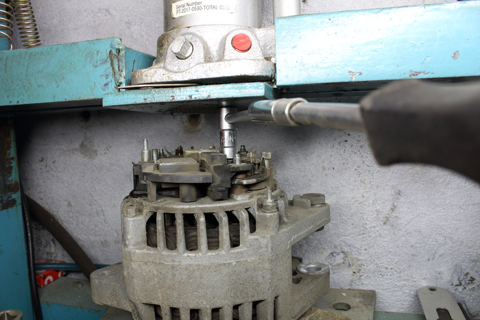 Снимает пластиковую крышку, реле регулятор и ставим генератор под пресс