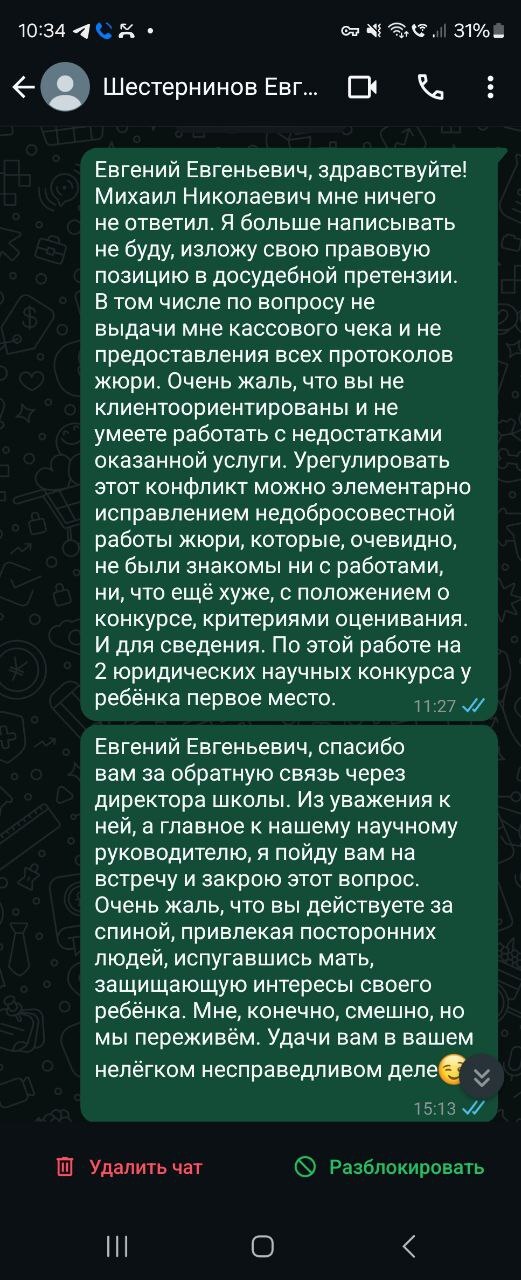 Шерстенинов Е.Е. вместо урегулирования конфликта (можно просто было выписать ребенку диплом, заслуженный, и все) позвонил Директору нашей школы. От бессилия ли, от страха ли за налоговые проверки, или испугавшись моей досудебной претензии, не знаю. Но со мной связался классный руководитель и попросил не писать досудебку))) Ну ок, досудебку писать не стала, написав лишь этому гражданину душещипательное сообщение о том, что я благодарна за обратную связь через Директора школы, что мне приятно, что он меня испугался, и что я пойду ему на встречу и не буду трясти фонд своими досудебками (по отсутствию кассы (может, она и была, но я ее не видела, как и своего кассового чека) я тоже хотела кое-куда написать, ибо что только блогеров наказывать?).