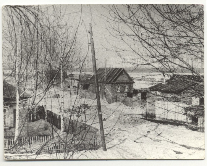 Савинка, ул. Мирная (позднее Мусина). Снято с крыши дома №5. Сквозь ветки деревьев можно разглядеть девятиэтажки на Ямашева. Март 1979 г. Автор фото Георгий Хитров.
