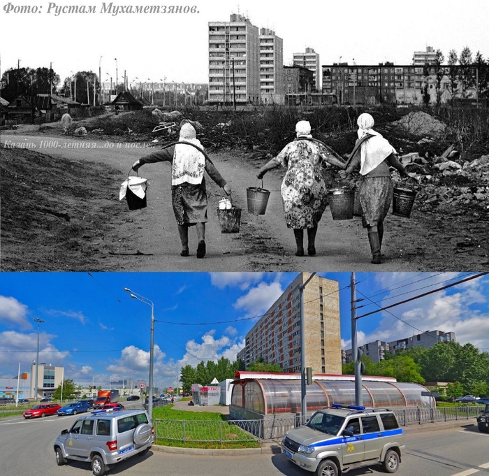 «Деревня Савинка. Это же место: Перекресток Ямашева/Мусина в 1978 году и в наше время. На переднем плане Мусина 59а, далее - 61а и 53. Частный сектор по левую сторону продержался до середины 2000-х, на его месте ныне ТЦ Парк Хаус».