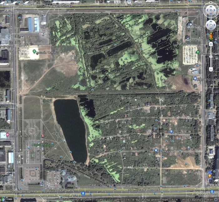 «Во, за это огромное спасибо, а то всё центр, центр. Вот параллельно стоят дома Мусина 49 слева, направо 47 по факту он как один дом, и там, в 47 доме прошла часть моего детства, т.к. там жили дед с бабушкой, деда уже нет как года 4, а бабушка еще жива, но уже не помнит никого. Так же, с родителями я жил на савинке на улице поперечно мирная 5, там был 1 этажный деревянный дом, в принципе, как и у всех, технология утепления стен называлась насыпушкой, насыпушка представляла собой 2 стены внутри набивали опилками, это как современные каркасные дома, только вот хорошо помню, что опилочным каркасным домам ничего не было, ничего не промерзало как например в современных каркасных домах утепленных минеральной ватой или пеноплексом. Как видим, 49 школа уже стояла в то время, так же стоял тепло узел, с другой стороны и тепло узла стояла и сейчас стоит трансформаторная подстанция которая снабжает многоэтажные дома, и отдельная линия была выведена на савинку, но мощности порой не хватало напряжение вечером опускалось порою до 160 вольт, соответственно у каждого дома к телевизору был подключён стабилизатор ,просто в розетку телевизор никто не включал, частенько слышал что у кого то преуспевающего в то время сгорели видеомагнитофоны и телевизоры из за обрыва нуля происходил скачок напряжения. Как мы видим, опщаги, не общежития, а именно опщаги так её иногда называли в то время через п, в то время не было. Между двух девятиэтажек располагалось один продуктовый, ранее он назывался филиал, потом он назывался Арча (плохой выбор был) но припоминаю там эти Рояли), там же продавались напитки Кристина. Помню мужики жаловались на то, что пиво прокисло (вот оно качество и натуральные продукты), молочка в бутылках, хлеб, ах, какой был хлеб в тех самых деревянных лотках помню запах до сих пор, далее магазин переименован Эдельвейс и под этим названием он стоял очень долго, ну и в какой-то момент его название сменилось на Магнит. Про пожар сзади нынешнего магнита не смогу подробно рассказать, был ещё мелкий, но запах помню. Так же, сзади нынешнего Магнит был приём стеклотары. Моя улица располагалась как раз напротив от этого магазина, в 90ые все женщины на пенсии сидели возле этих магазинов и продавали кто семечки, кто лук, чеснок, огурцы, помидоры, редиску. Так же небольшой рынок был примерно где идут эти три ханум, сейчас тут находится тат мак, не помню какая-то пекарня, что-то ещё. На этом месте недалеко стоял киоск Мальборо, был прокат видеокассет с залогом, торговали и обычными кассетами, в то время построили торговые ряды Анастасия, там до сих пор находится рюмочная, ну и клиенты у них соответственно имеются) рядом с магазином Магнит стояло, и сейчас стоит 2 этажное здание, там был супермагазин Электроника. И знаменитая, игра Ну погоди продавалась именно там, были часы электроника 7, припоминаю шариковые ручки с часами. Но, это всё ничто, в сравнении с стереоэлектрофоном Электроника 017 стерео, которая состояла из 2 блоков, усилителя и проигрывателя (я его позже сфоткаю, и эти 2 блока мне радуют душу больше чем какой-нибудь ресивер пионер даже серии ax 5) может из-за того, что параметры не хилые и мощность, и частотный диапазон. Ближе к 85 ым уже стояла асфальтная дорога между савинкой и этими многоквартирными жилыми домами, следует отметить что первая девятиэтажка экспериментальная, так ж