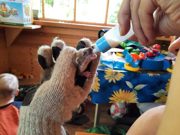 Малыш пережил ночь и радостно получает свою пищу из пипетки. Но мы до сих пор на 100% не уверены в его родословной: уж больно крупный щенок для ласки..