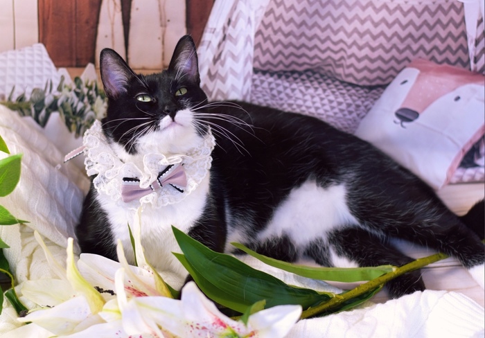 Сейчас он живет у нас с мужем на передержке Как мы взяли на передержку местного "авторитета" Зайчика Фотографировать его, как других кошек, в розово-зефирной локации к 14 февраля я не собиралась, но шутки ради все же нарядила его в комбинезончик с ушками. Несоответствие девчачьей локации его брутальности мне показалось таким очаровательным, что я все же не удержалась от фотосессии)