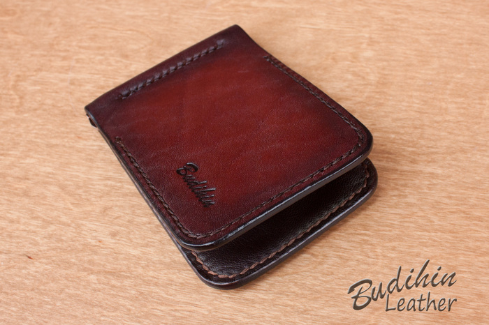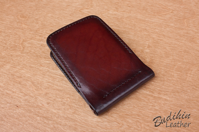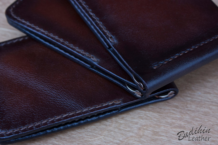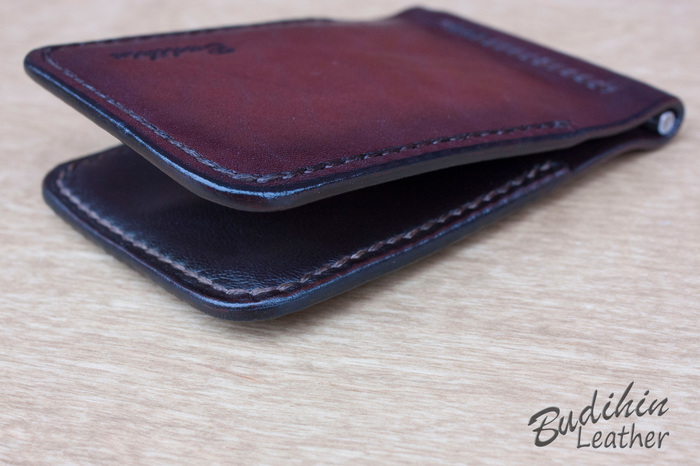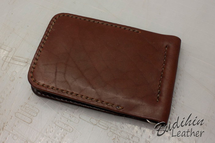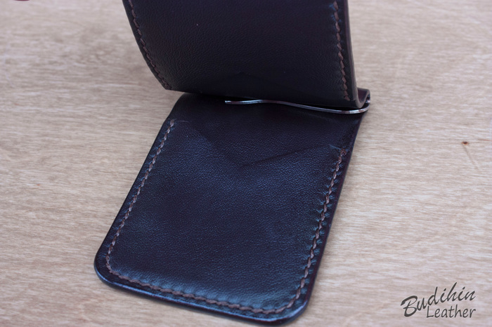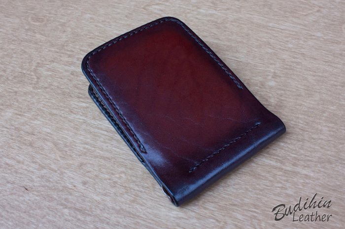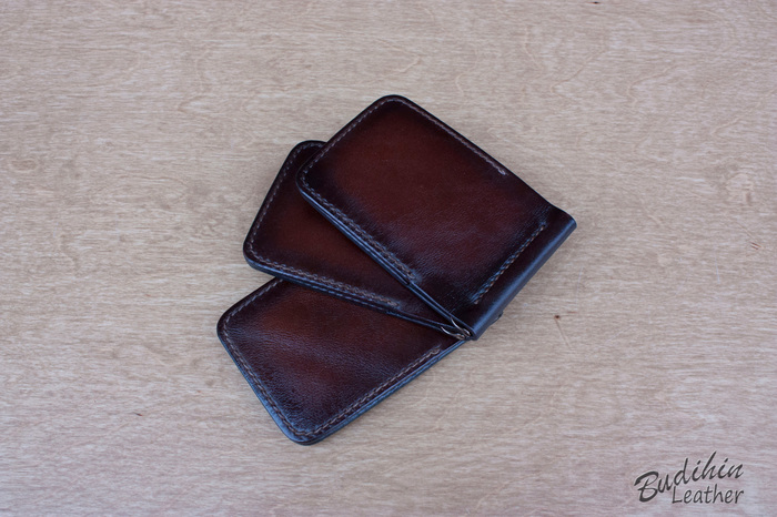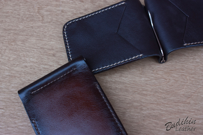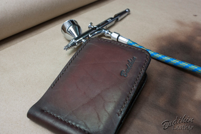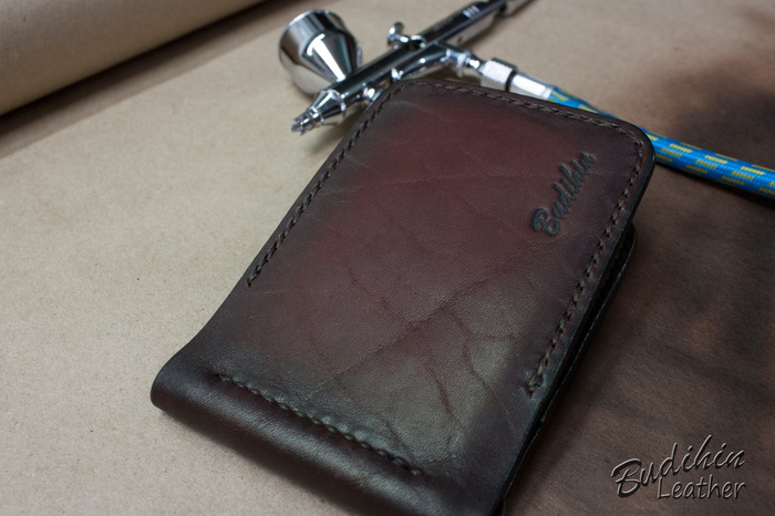 После этого уже сшиваю посередине, сразу поставив зажим для купюр. Пора приступать к покраске, изначально прокрашиваю губкой торцы что бы потом не докрашивать из аэрографа и не попасть на подклад. После этого из аэрографа наношу краситель на заготовку. В связи с тем что без нанесенного финиша сфоторгафировать нормально не получается, пусть будет хоть такая фотография. После нанесения финиша появится глубина и станет хорошо видно изначальный цвет кожи и переход на более темные участки.