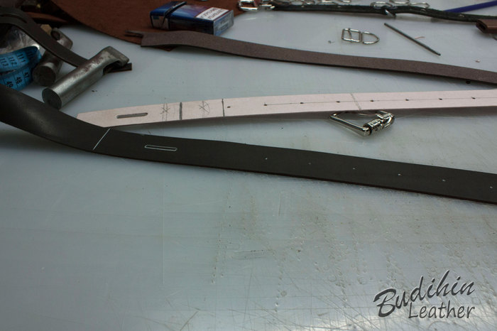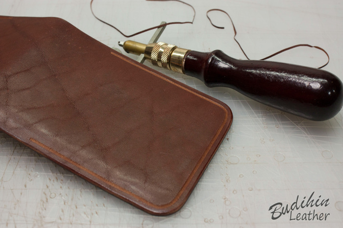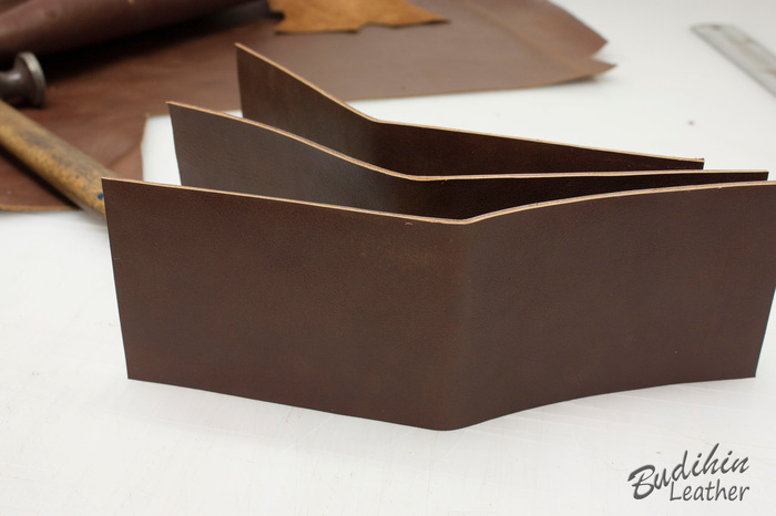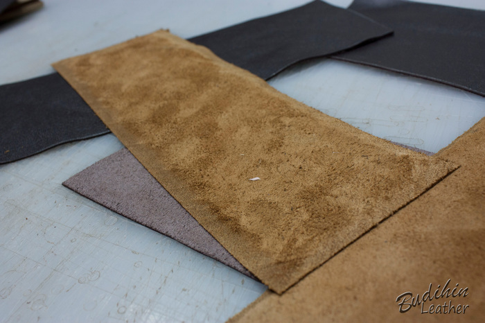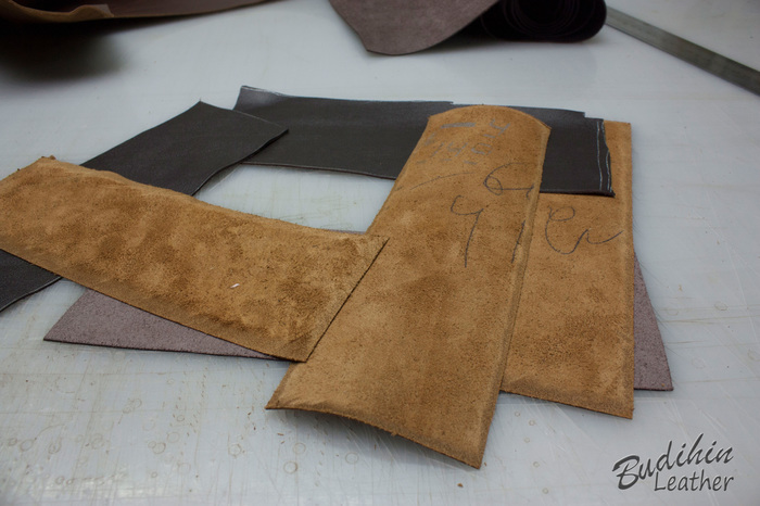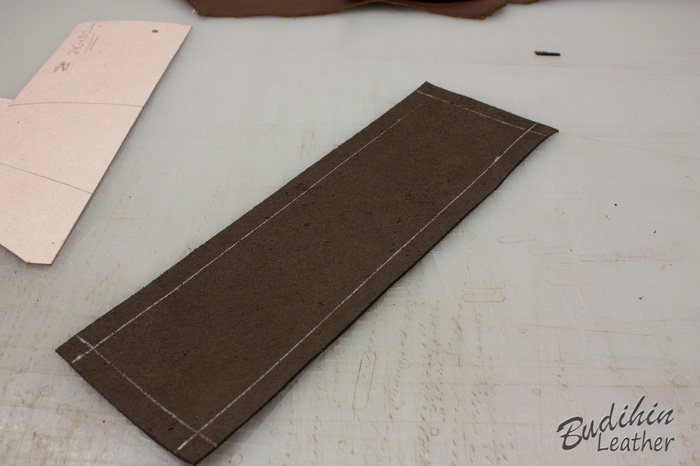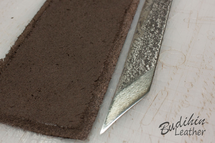 Для начала отрезаю по выкройке одинаковые куски кожи обоих цветов. Одна пойдет на лицо, вторая станет подкладом. Выкройка изначально больше на 4 мм, так как при склеивании и пробивке молотком мягкую кожу все равно чуть поведет и проще обрезать край, чем ловить миллиметры, да и обрабатывать торец так намного проще. Можно конечно делать и из одного слоя кожи, но у меня она слишком мягкая и ворс уж больно большой, плюс продавец что то писал ручкой. После этого ножом утоньшаю края на лицевой коже, что бы после склеивания и прошивки лицо было немного скругленным.