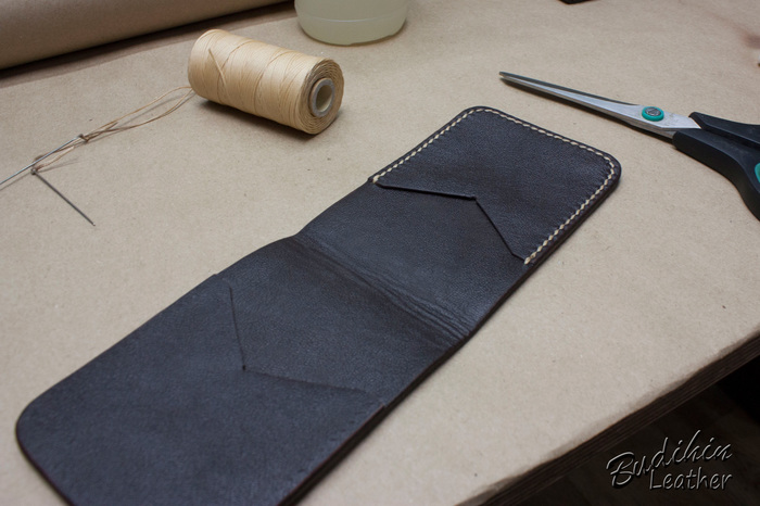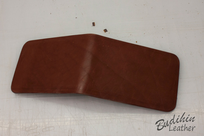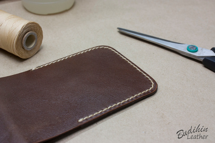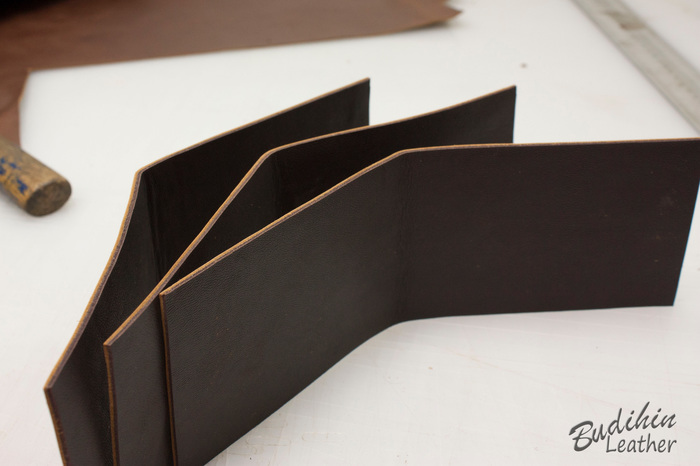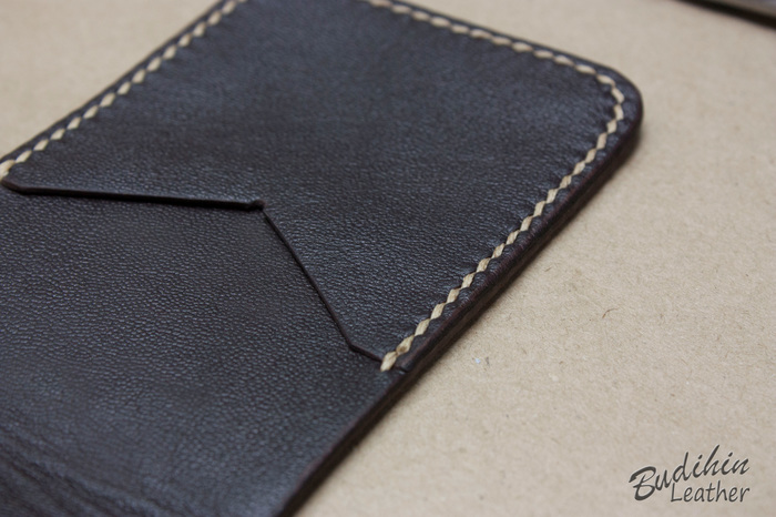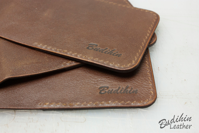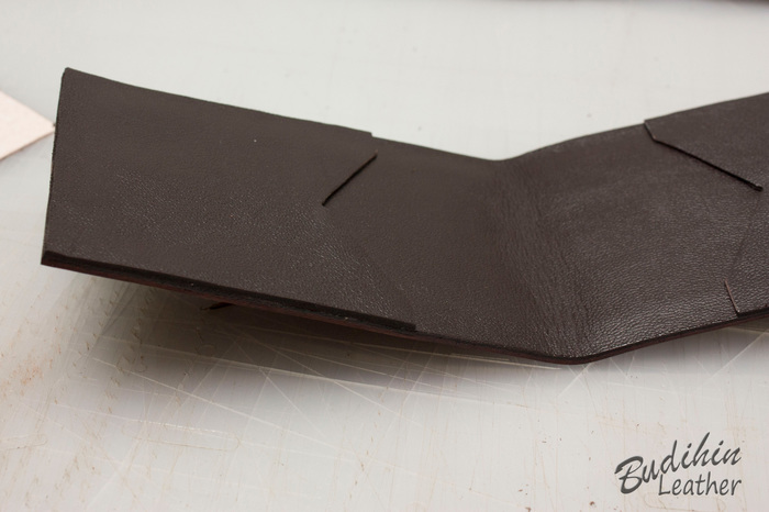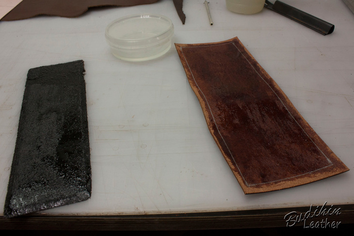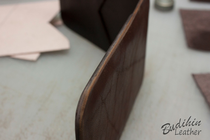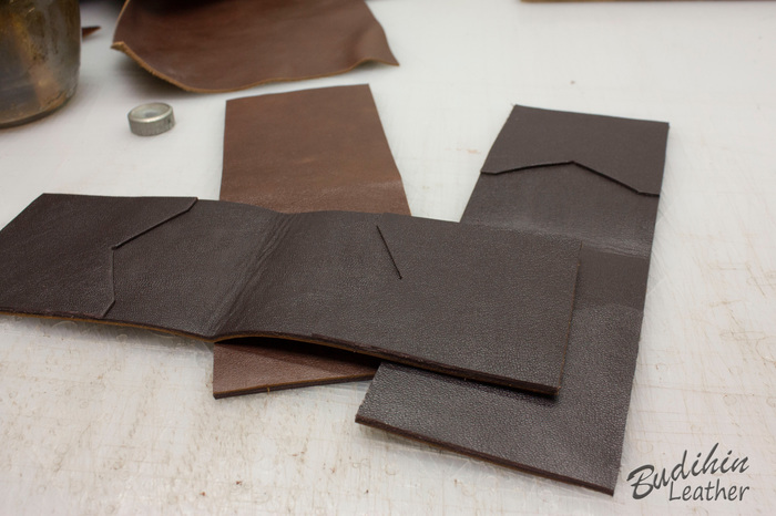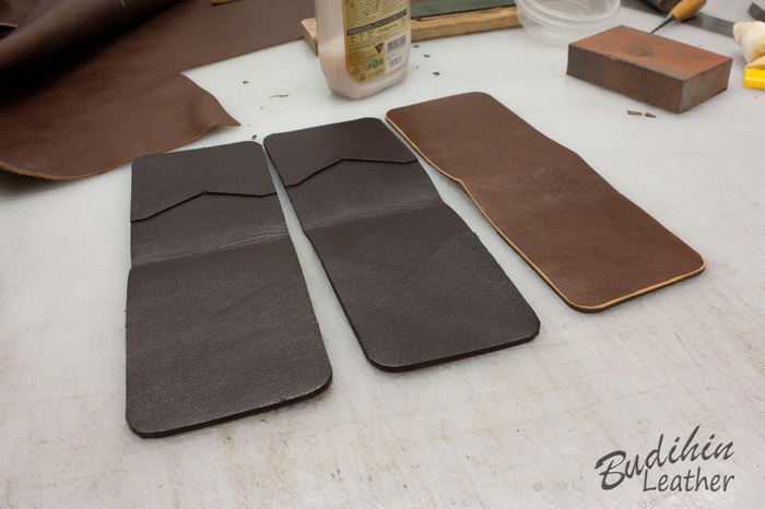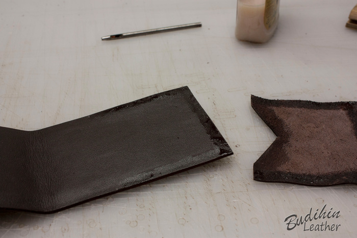 Нарезаю заготовки кармашков для карт, их я делаю так же на 2-3 мм больше, что бы потом просто отрезать лишнее. Наношу финиш Kezal со стороны, где будет вставляться карта, кожа в том месте становится более грубая и не будет в дальнейшем распушаться.