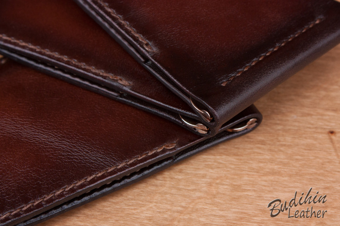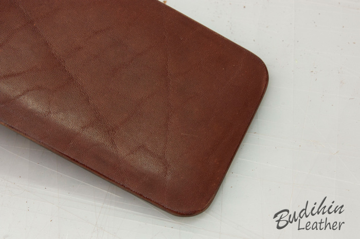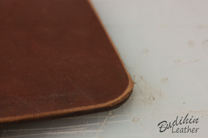 После первого прохода 180 шкуркой, обрезаю углы и еще раз наношу финиш. После второй обработки 180 шкуркой торцы выглядят вот так. Торцбилом на мягкой коже не пользуюсь от слова совсем, то ли руки у меня кривые и я его не могу нормально заточить, то ли что, то делаю не так. Но результат его применения на мягкой коже всегда ужасен и в разы проигрывает шкурке.
