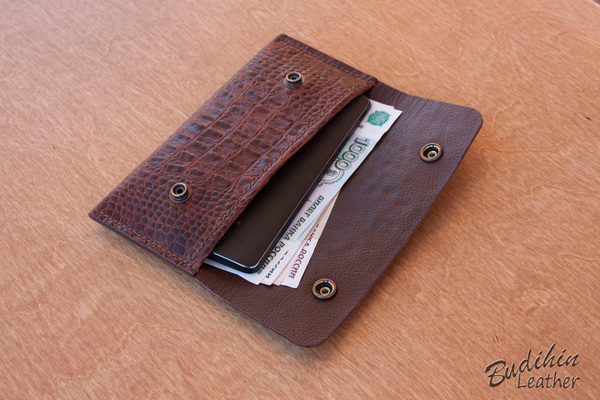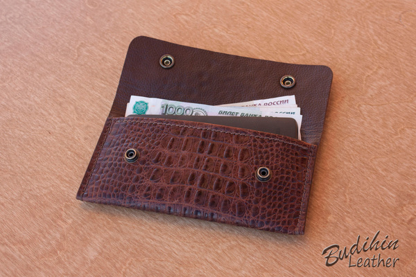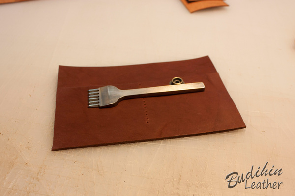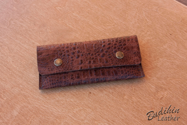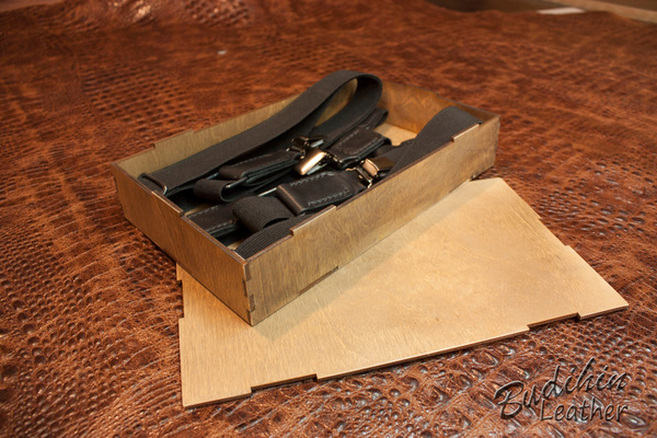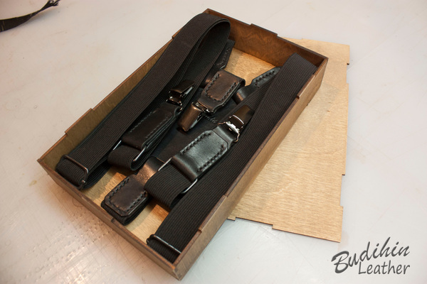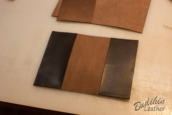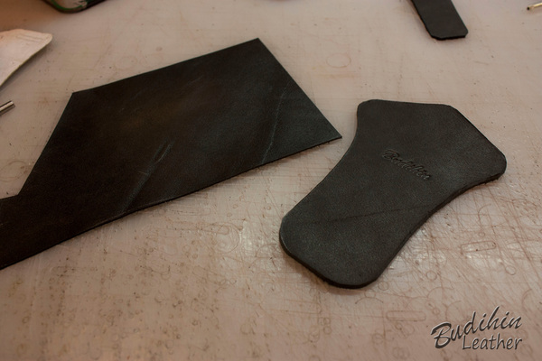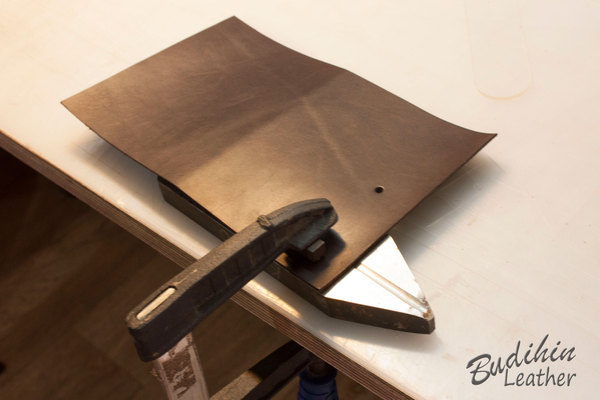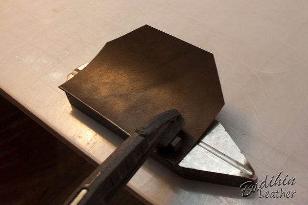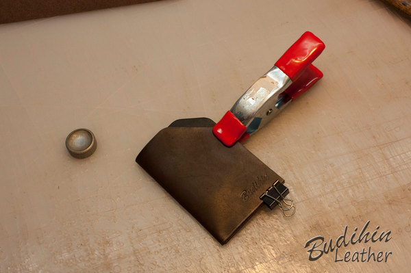 После того как клише проставлено, а перегородка высохла и обрезана по нужным нам размерам, все части собираем на клей и даем подсохнуть, так как кожа достаточно грубая, я ее зафиксировал прищепками.