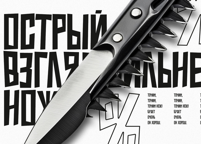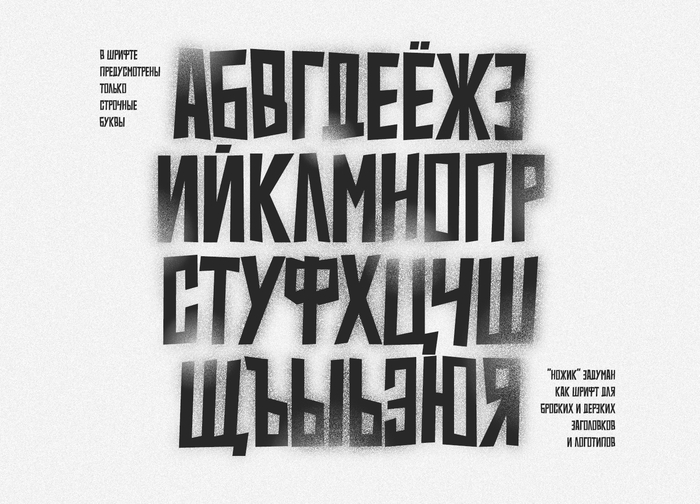 Резкий, острый и громкоговорящий. Это все про режущий шрифт Ножик, заточенный под плакаты, логотипы, заголовки сайтов. История шрифта уходит в те времена, когда я только начинал заниматься афишами мероприятий и искал узкий универсальный гротеск. Но специфика была агрессивной и не все шрифты были "с характером".