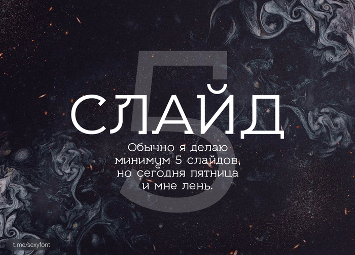 Здесь я выкладываю презентации шрифтов с кириллицей. Иногда беру кусочки дизайна от автора, но чаще собираю всё сам, чтобы показать шрифт в деле. Я не автор самих шрифтов, их названия всегда есть на первом слайде. Обычно нахожу бесплатные варианты, но перед коммерческим использованием советую перепроверить лицензию.