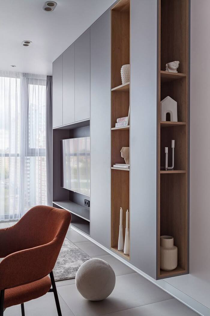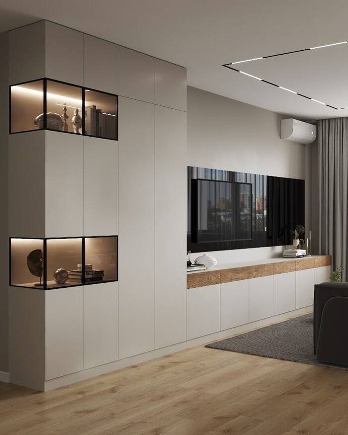 Хранение в зоне тв. Если у вас маленькая квартира, не используйте длинные узкие тумбы. В них помещается слишком мало вещей. Попробуйте вот такие варианты.