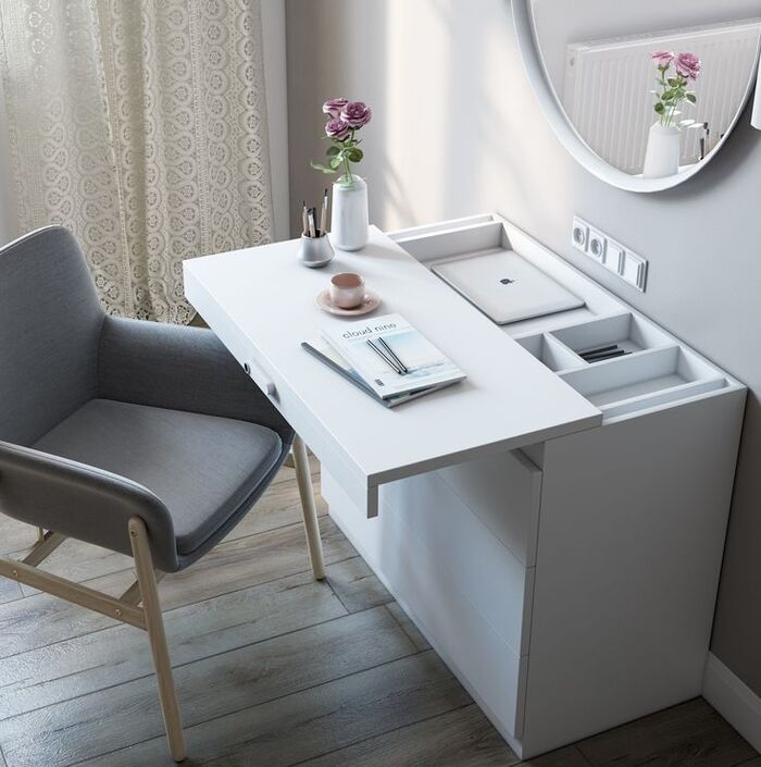Если у вас робот-пылесос очень удобно делать подвесные прикроватные тумбы и макияжный столик.