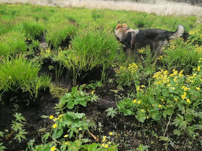 Вы могли заметить, что на фотографиях земля не естественного чёрного цвета. Это - следы от пожаров, которые бушевали в Надеждинском районе почти всю зиму. В нашем лесу почти не осталось земли, которая бы не выгорела и не превратилась в чёрный ковёр.