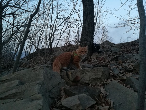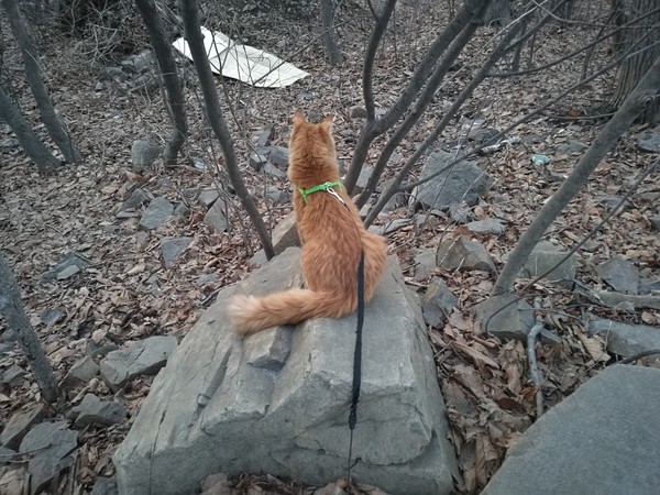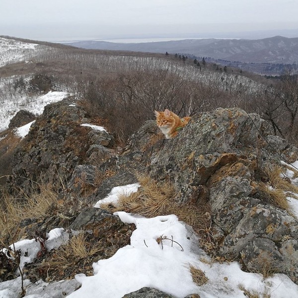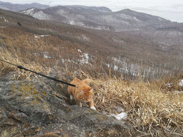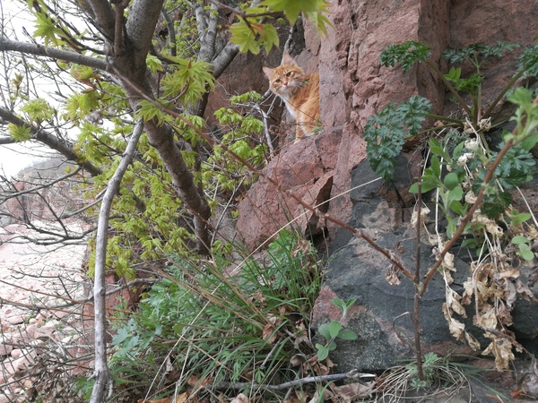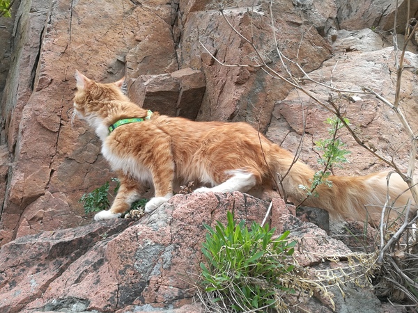 Первым делом после прибытия в пункт назначения, кот полез на свои любимые скалы! Лазил там около часа, потом уложился в свою сумку и уснул. Перед тем, как пошли обратно ещё немного попрыгал и погрыз пару веток.