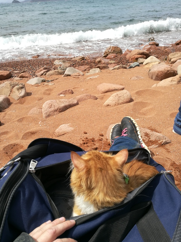 С котом мы часто останавливались, потому что коту надо было все осмотреть, обнюхать, погрызть. К тому же он впервые был на море, первое время паниковал из-за сильного ветра, но потом привык.