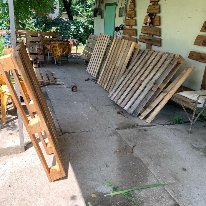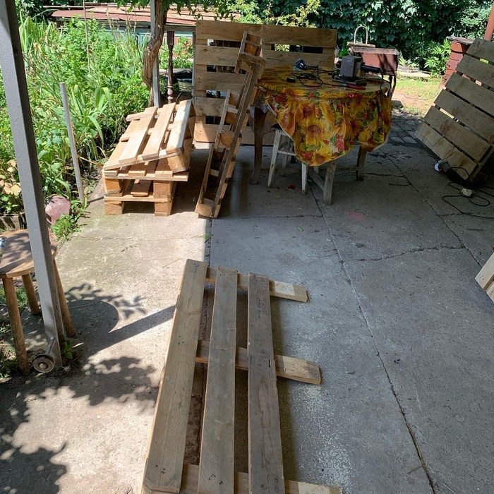 Начал я, естественно, с поиска паллет. Позвонил в несколько фирм по продаже паллет и понял, что в Краснодаре у людей и так все в поряде и им абсолютно незачем отвечать на телефонные звонки в рабочее время) Духом не упал, и начал штурмовать визитами поселковые магниты/пятерочки/строительные магазины и прочие промышленные места. Оказалось, что обычно многие предприятия имеют контракты на обратную поставку этих паллет, но в 4-м месте мне улыбнулась удача(строительный магазин). Мы договорились о цене 150р за паллету и мне предложили отобрать их самостоятельно из большой кучи использованных, хранящихся на открытом воздухе. Я купил 10шт 1200х1000 / 1000х1000 вперемешку, чтобы не стеснятся в выборе и легко экспериментировать. Хотя для 2-х скамеек в итоге потребовалось~6шт. Вам потребуется скорее всего 7, тк с первой можно немного косякнуть;)