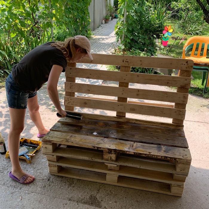 -покрываем лаком, шкурим заново, если что-то не понравилось и опять лачим. Летом на юге сохнет мин за 30. Все, лавочка почти готова, осталось пару последних штрихов.