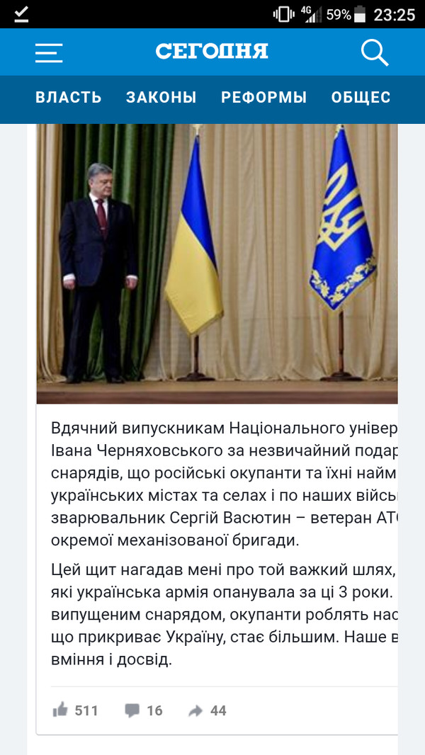 "Благодарен выпускникам Национального университета обороны Украины им. Ивана Черняховского за необычный подарок. Щит из осколков снарядов, которые российские оккупанты и их наемники выпустили по мирным украинским городам и селам и по нашим военным, изготовил сварщик Сергей Васютин – ветеран АТО, в 2014-м рядовой 28-й отдельной механизированной бригады", – написал Порошенко.