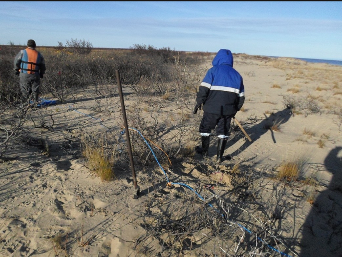 Далее, после топографов проходит сейсмоотряд. Это самая грязная и тяжелая работа. В их обязанности входит расставлять сейсмодатчики. В простонародии называющиеся морковками. Ну потому что похожи. Эти самые морковки подключаются к еще одному длиннющему проводу, который называется косой. Коса в свою очередь подключается к геофизической станции-будка на колесах, которая оборудована по последнему слову техники.
