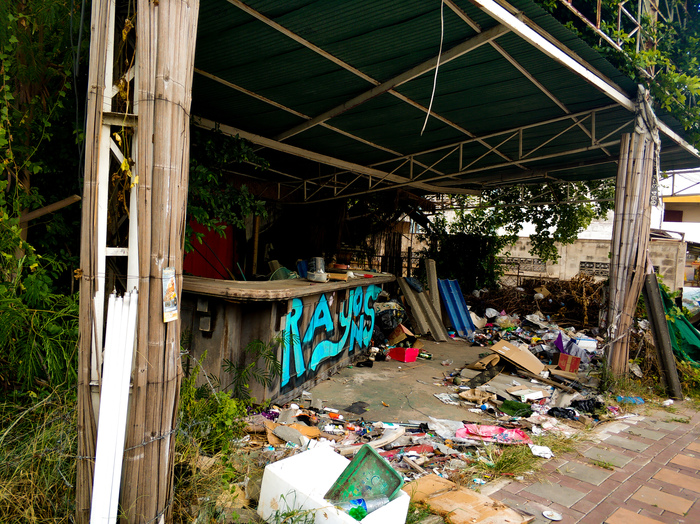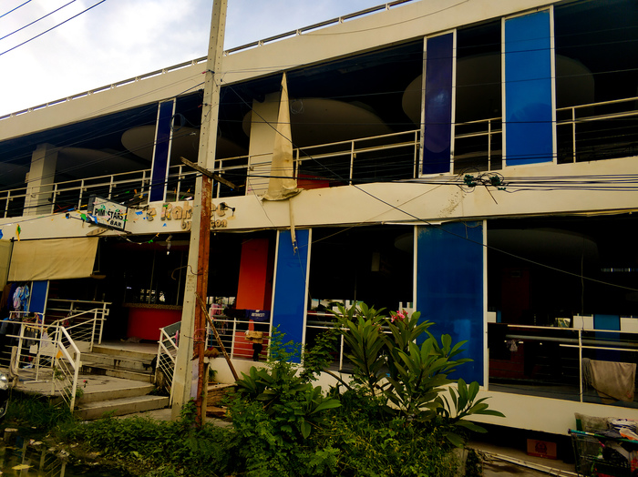 Большой проститутошный го-го бар. Раньше тут на столах крутили деревянными жопами исанские телочки и приравненые к ним категории граждан. А сейчас сквотеры сушат бельишко