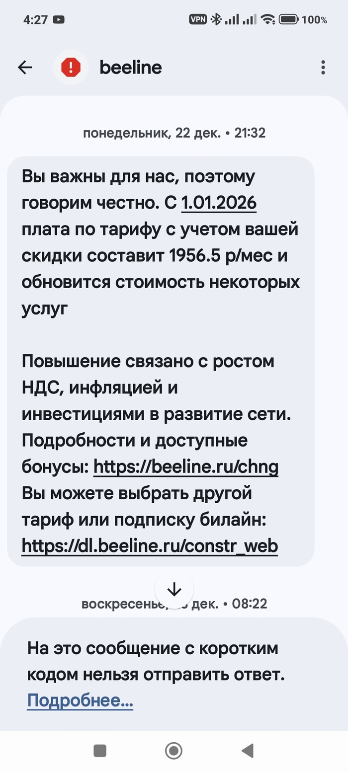 Не хотел писать - но просто полыхает! В конце декабря получил СМС с извещением о подорожании моего тарифа с 1 января 2026 с указанием суммы.