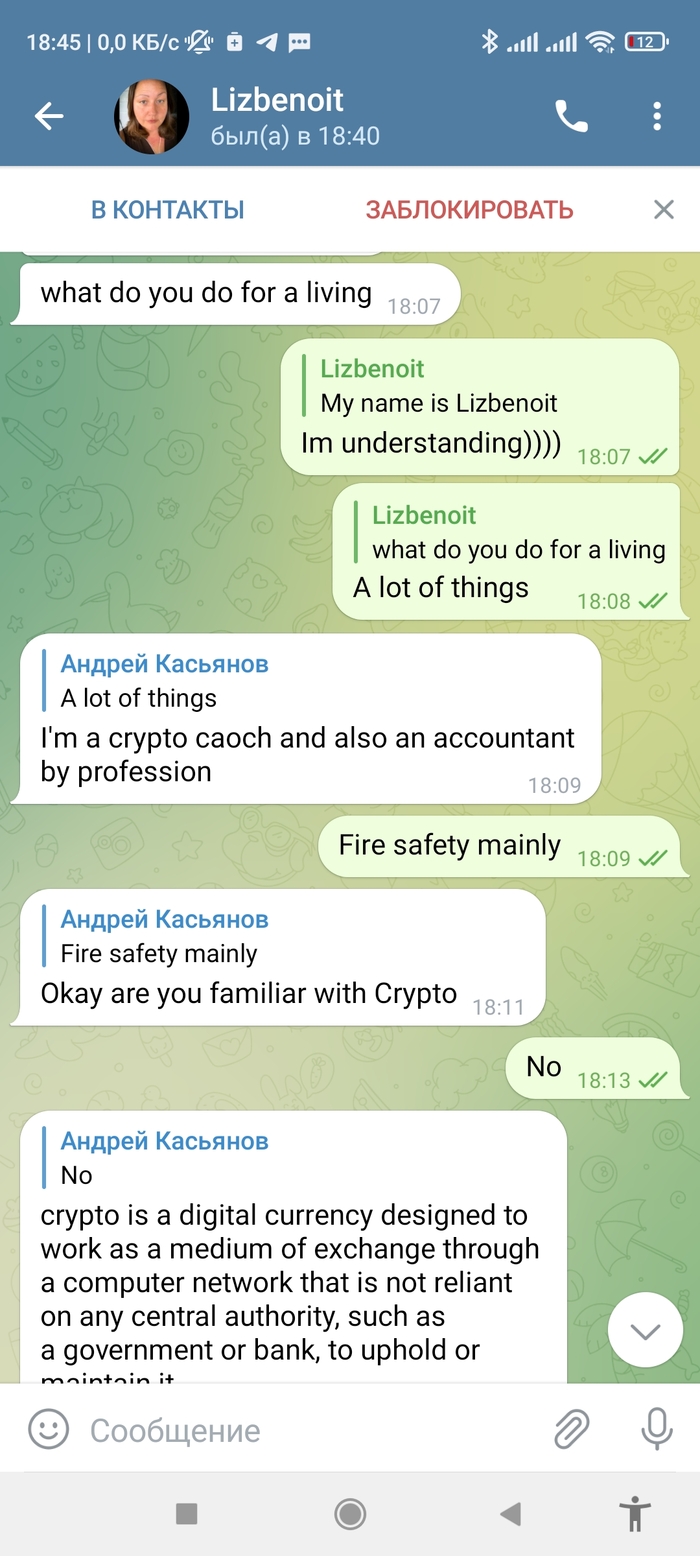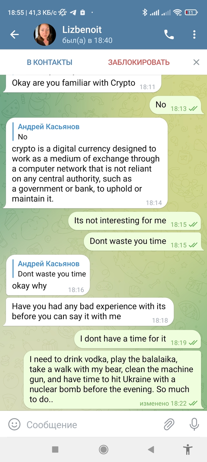 Сегодня пишем мне в телегу мадам импортная (ну или бот, но времени выяснятъ не было):