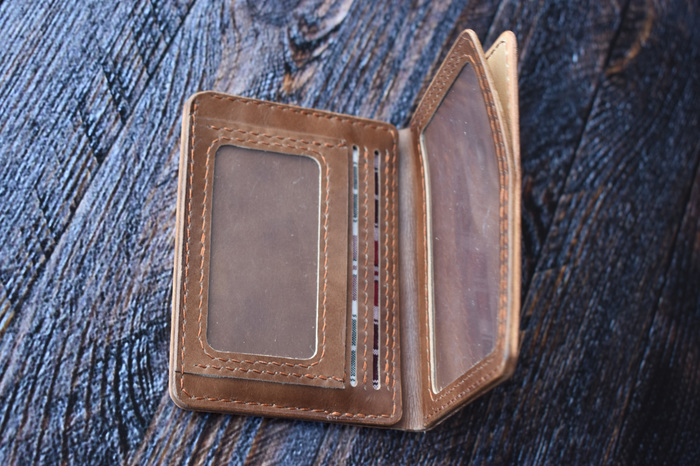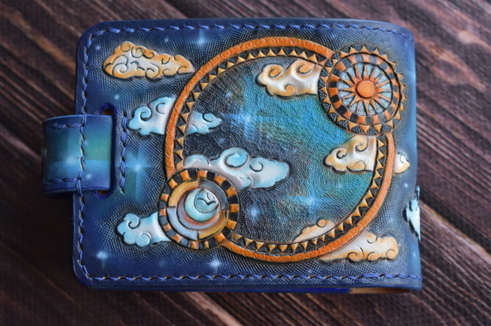 Чтоб кожа сильно не подсыхала и ее не пришлось часто мочить, все манипуляции я провожу сначала на одной части портмоне, затем- на другой. Пока одна часть в работе, другая- ждёт своей очереди под полиэтиленом.