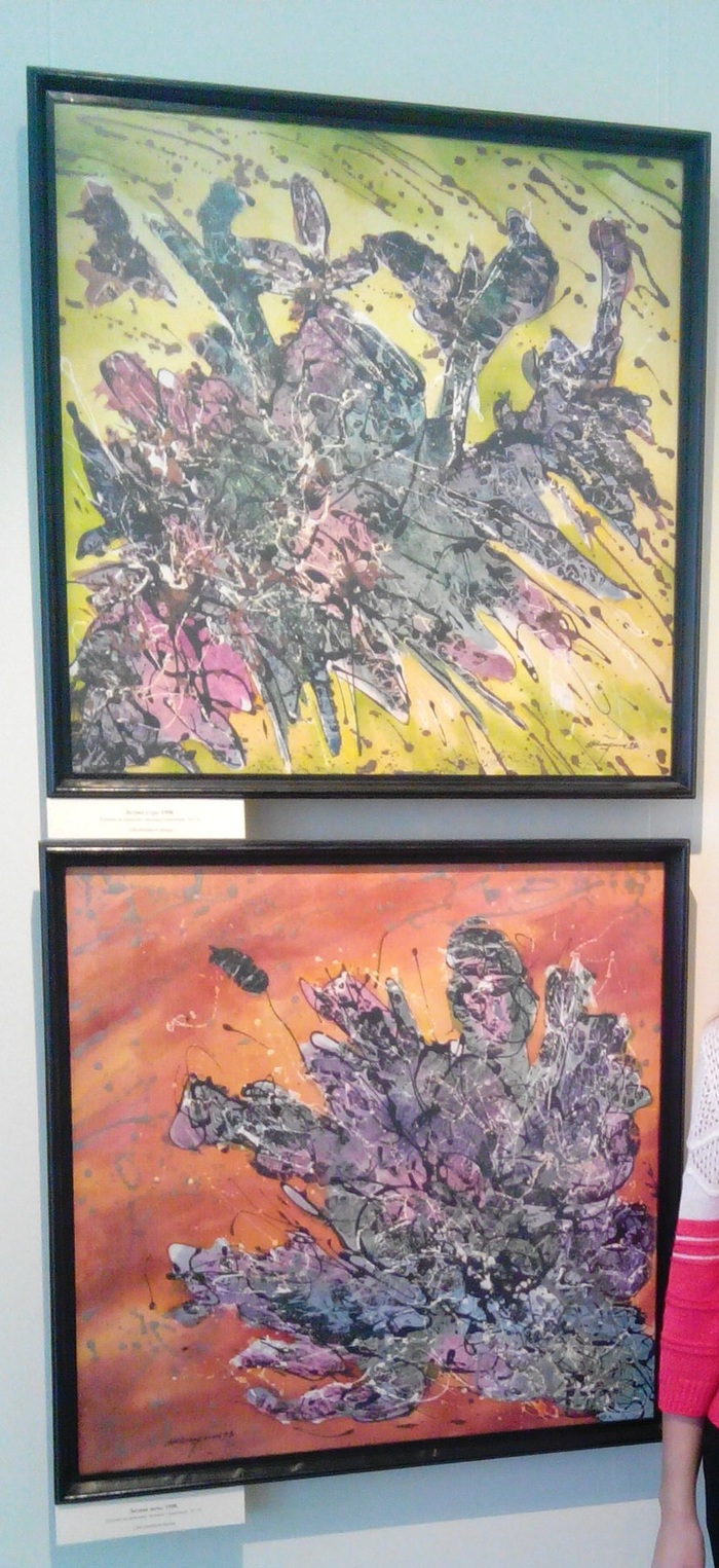 В общем исходные данные: 2016 год. Музей изобразительных искусств Кузбасса (г. Кемерово). Нижняя картина с фотографии (фото было сделано на доисторический телефон, поэтому приблизить не получается). Была выставка каких-то Сибирских художников. Насколько я помню, картина входила в серию из трех картин, названия картин вроде были связаны с временами года или временем суток. И вроде были нарисованы на наждачной бумаге.