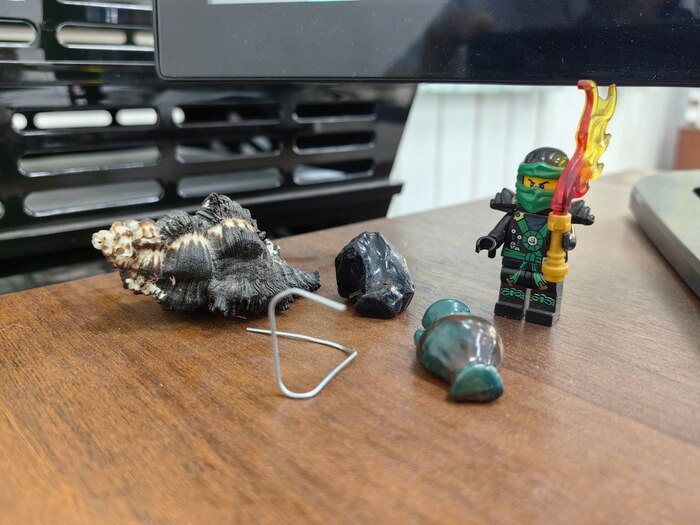 Опять сын, примерно в пять лет. Нашел черный непонятный камешек на даче. Попросил узнать, что это. Забираю его на работу, так и лежит теперь.