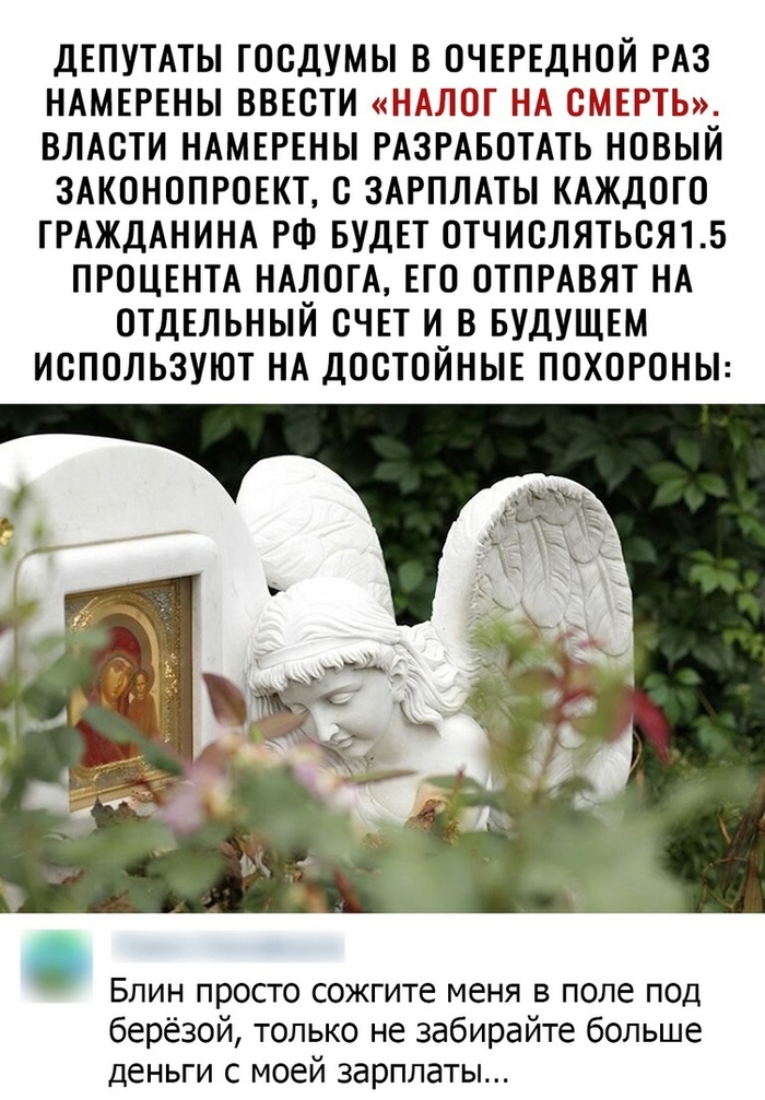 На днях Минстрой предложил ввести в России новый фискальный побор, который уже успели назвать «налогом на смерть». Предполагается брать с фонда оплаты труда предприятий (читай, работников) ежемесячный платеж в 1,5%. Эти деньги, по задумке чиновников Минстроя, гарантировали бы человеку достойные похороны.