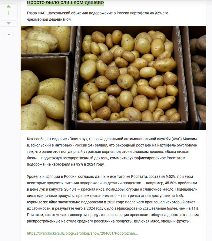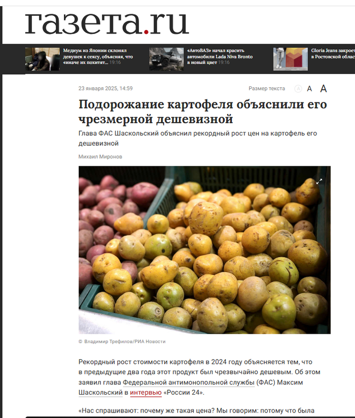 Как сообщает издание «Газета.ру», глава Федеральной антимонопольной службы (ФАС) Максим Шаскольский в интервью «России 24» заявил, что рекордный рост цен на картофель обусловлен тем, что ранее этот популярный у граждан корнеплод стоил слишком дешево. «Была низкая база» — подчеркнул государственный деятель, комментируя зафиксированное Росстатом подорожание картофеля на 92% в 2024 году.