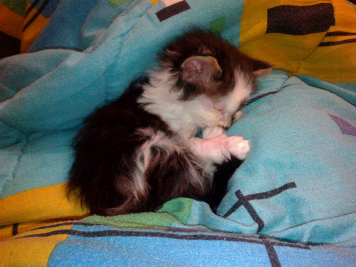 В очередной раз поругавшись со своей бывшей женой, я решил пойти на улицу и покурить, перевести дух, так сказать. На дворе был конец апреля и по вечерам было еще достаточно холодно, одевшись и взяв сигаретку, я вышел на улицу, прикурил и стал гонять в голове мысли о том, как наши вторые половины любят раздувать из мух слонов. Погрузившись достаточно глубоко в свои размышления я услышал еле различимый хрип, сначала не понял, что это, а потом опустив взгляд я увидел маленький комочек шерсти, который еле полз и кряхтел от холода, боли и несправедливости этого мира. Взяв его в руки ужаснулся его состоянию, глаза залеплены гноем, весь в блохах, одни косточки и шкурка. Не раздумывая засунул его под куртку и пошел в магазин за молоком. Придя домой и показав свою находку своей половине, о ссоре сразу забыли и стали думать, что делать, первым делом помыли и организовали ему домик, поселили на кухне, так как кошка не очень радушно восприняла пополнение в семье, чтобы не произошло чего, расселили их, так сказать. Проведя ночь в переживаниях за мелкого, с утра бегом понесся с ним в ветеринарку, осмотрев найденыша врачи сказали, что 50/50-выживет, или помрет, я решил, что будь, что будет, но я приложу все усилия для того, чтобы его выходить. И понеслось, каждый день на уколы, купил смесь для кормления котят, каждые 2 часа вставали и кормили его. Иногда случались ситуации, когда я думал, что все, конец, он очень плакал, был беспокойным, но положив его себе на грудь, он успокаивался и засыпал) Думали о том, как же его назвать, я предлагал назвать Пиратом, но поразмыслив отказался от этого и решили мы его назвать Счастливчиком, ну а по простому Лаки. В таком темпе прошел месяц, малыш окреп и стал полноправным членом семьи) Забыл сказать о том, что у него изначально были проблемы с глазами, спасти зрение, к сожалению, не удалось... Один глаз пришлось удалить, но тем не менее это полноценный кот, не испытывает никаких неудобств, играется с кошкой и вообще это самое любящее создание на свете) И те, кто говорит о том, что кот никогда не будет так предан, как собака, ошибаются) У меня самый любящий и преданный кот на всем свете)