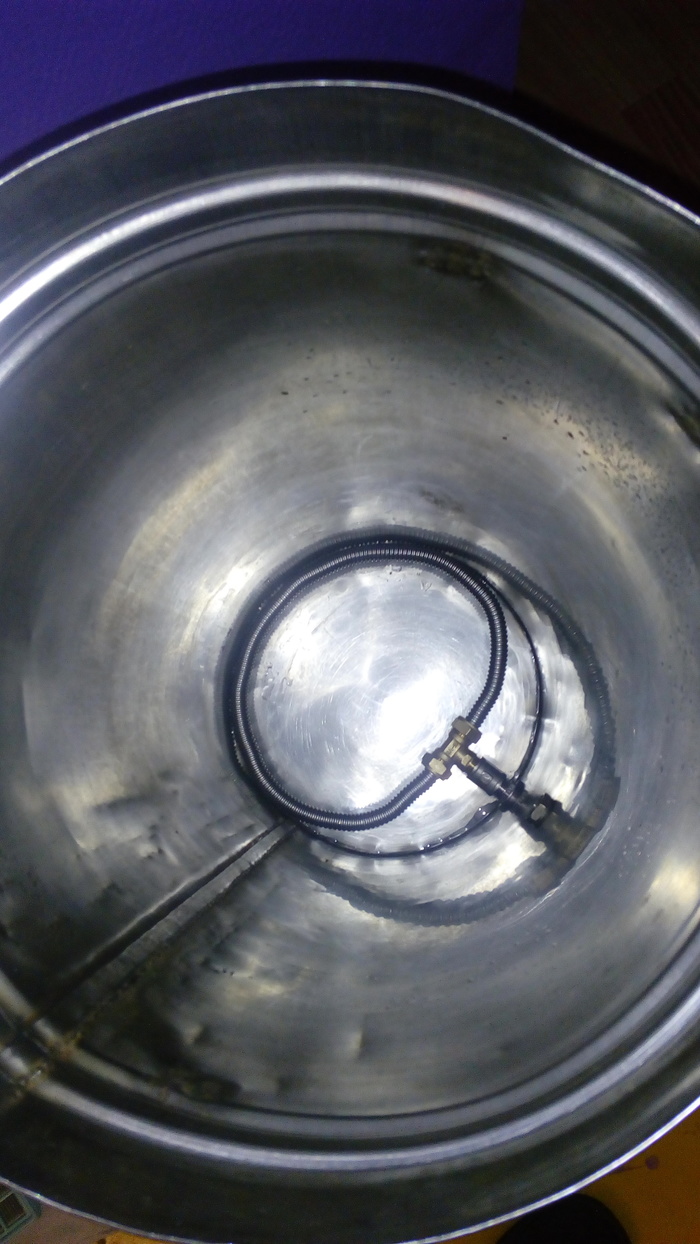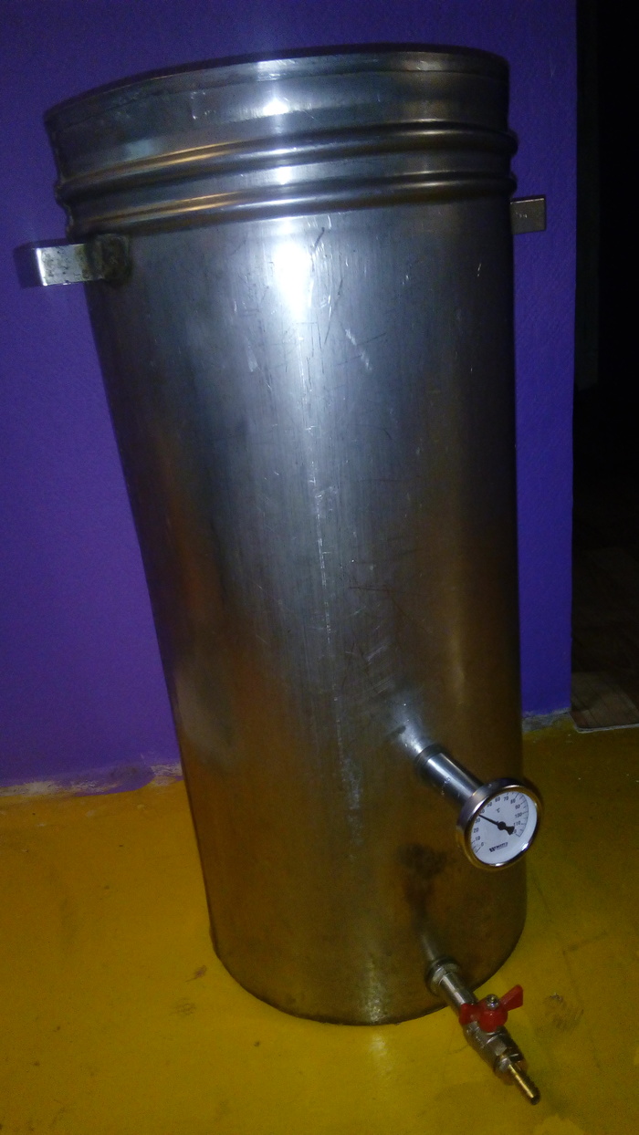 Я начал искать инфу в интернете и нашел много полезной информации.Решив заняться пивоварением полного цикла я докупил бродильных баков, гидрозатворов, приобрёл ореометр, На местной интернет барахолке я нашел подходящий по объему бак за 1500 рэ, вырезал в нём пару отверстий, под термометр и кран (сразу скажу, что под кран я сделал кривое отверстие и на холодную он немного подтекает, но неважно) сделал фильтр систему, сообразил чиллер (устройство для охлаждения готового сусла. Сделал из обычной гофрированной нержавейки полдюймовки, взял 10 метров трубы и свернул в пружину, фото могу добавить позже, если кому будет интересно) и заказал себе мельницу для солода с Алика.