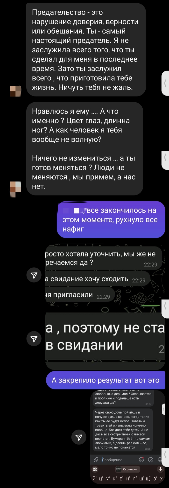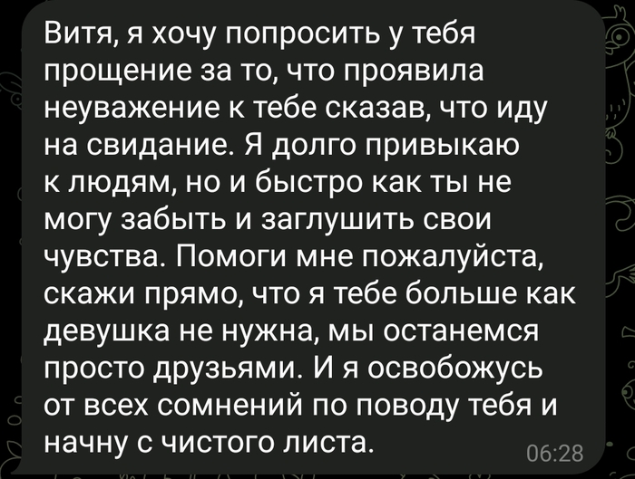 И оказывается, она не может так быстро как я заглушить свои эмоции, что она не ходила в итоге на свидание итп. А я уже просто не верю человеку, кто мне дас гарантии, что она просто не сходила неудачно на свидание, и подумав не решила "извиниться". Я отказал. Написала моему лучшему другу, он написал мне. Решили посмотреть что будет писать дальше, в итоге начала к нему клеиться, не получила должного вау эффекта и поругалась с ним.