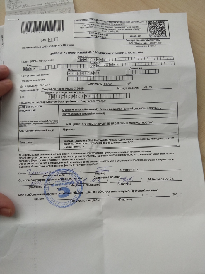 Сам телефон специалист даже не включал, ничего не смотрел, просто с наших слов записал неисправности и все, телефон улетел в Москву. Сказал, что если неисправность серьезная, то просто отправят новый телефон, если только дисплей, то скорее всего заменят и вернут обратно.