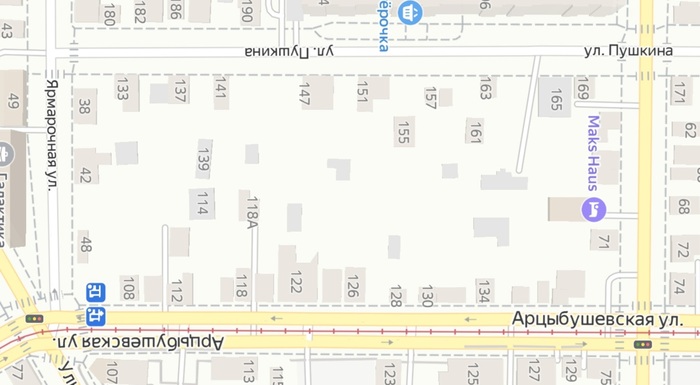 В 2016 году состоялся аукцион на развитие квартала в границах улиц Арцыбушевская, Ярмарочная, Пушкина и Маяковского, вот этого: