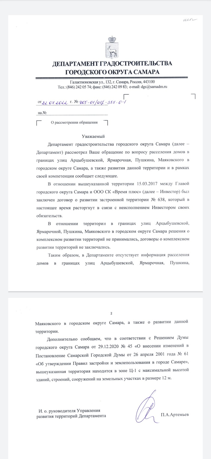 Шло время Времени плюс, но к февралю 2022 году никто никого не расселил, более того, неожиданно город отказался от застройщика и написал письмо об одностороннем отказе от исполнения контракта, но так как застройщик уже потратил кучу бабла на проект планировки территории, то был очень против такого поворота событий и начал судиться с городом.