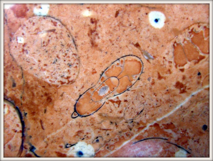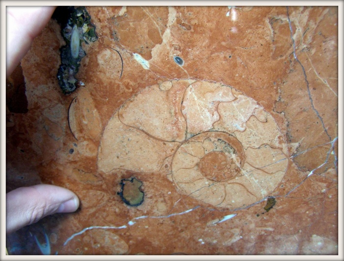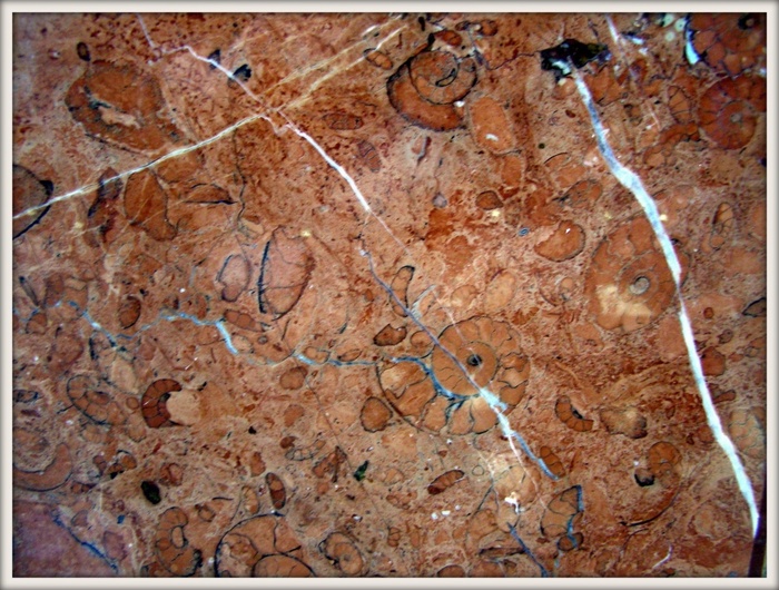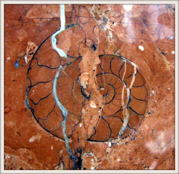 По привычке, обратив внимание на породы из которых изготовлены плитки, администратор рассмотрел отчётливые следы морских мезозойских организмов. Заметить их было не трудно, некоторые выделялись довольно контрастно и были достаточно крупными. Конечно, странным образом я выделялся среди посетителей чьи фотоаппараты были обращены к технике, я же обходил колонны и запечатлевал с близкого расстояния древности, чем вызвал у некоторые справедливые вопросы. Разнообразием остатков фауны облицовка похвастать не может, но представляет несомненный интерес. В массе своей обнаружились продольные и поперечные прошлифовки аммонитов разного размера. Вторыми по встречаемости стали ростры белемнитов. Тоже вполне живописные и напоминающие один из экспонатов музея. Своеобразные «пули геологического времени», навсегда застрявшие в породе. Изредка попадались остатки раковин, то ли двустворок, то ли брахиопод.