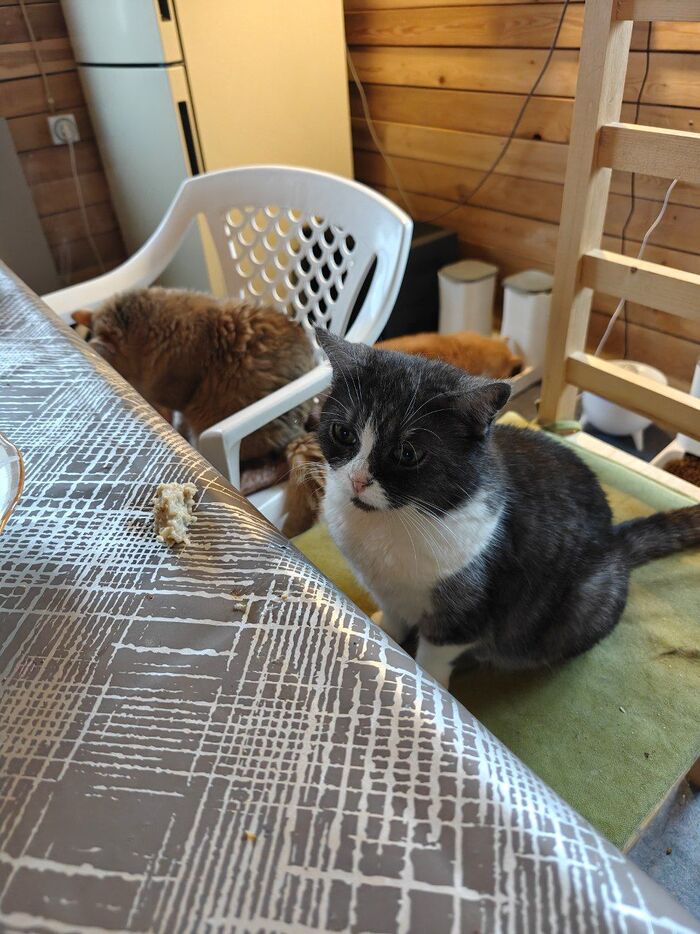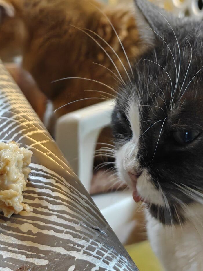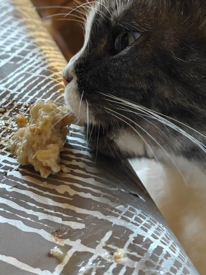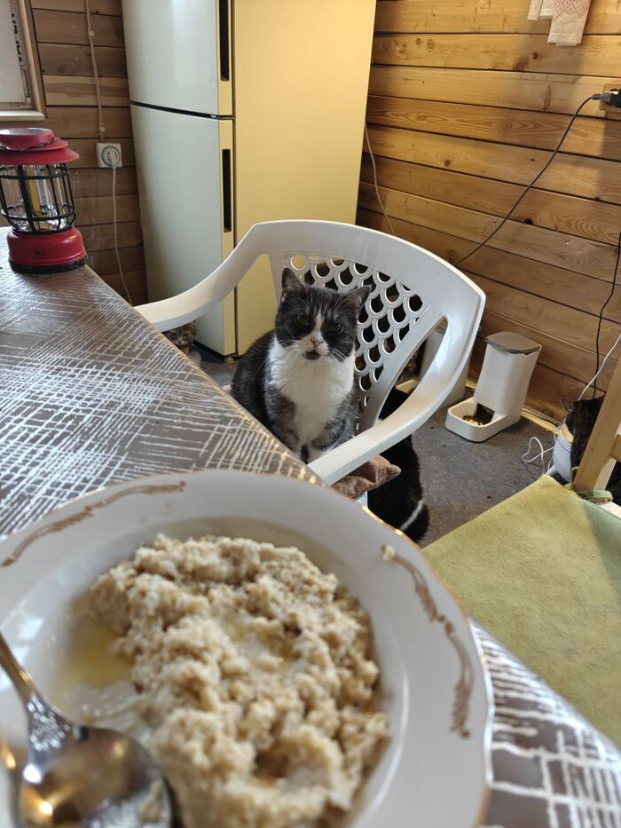 Сейчас я болею, аппетита совсем нет, но есть надо. Сварила себе кашу (овсяная, самый крупный помол в прозрачном пакете). Кашу, честно скажу, я так и не поняла. Зато Мамулио и Пумяша мне помогли. Я не знаю, что их там привлекает в этой каше (недавно, кто-то залез в мультиварку лапой). С учётом того, что у них в доступе мясо и корм практически холистик.