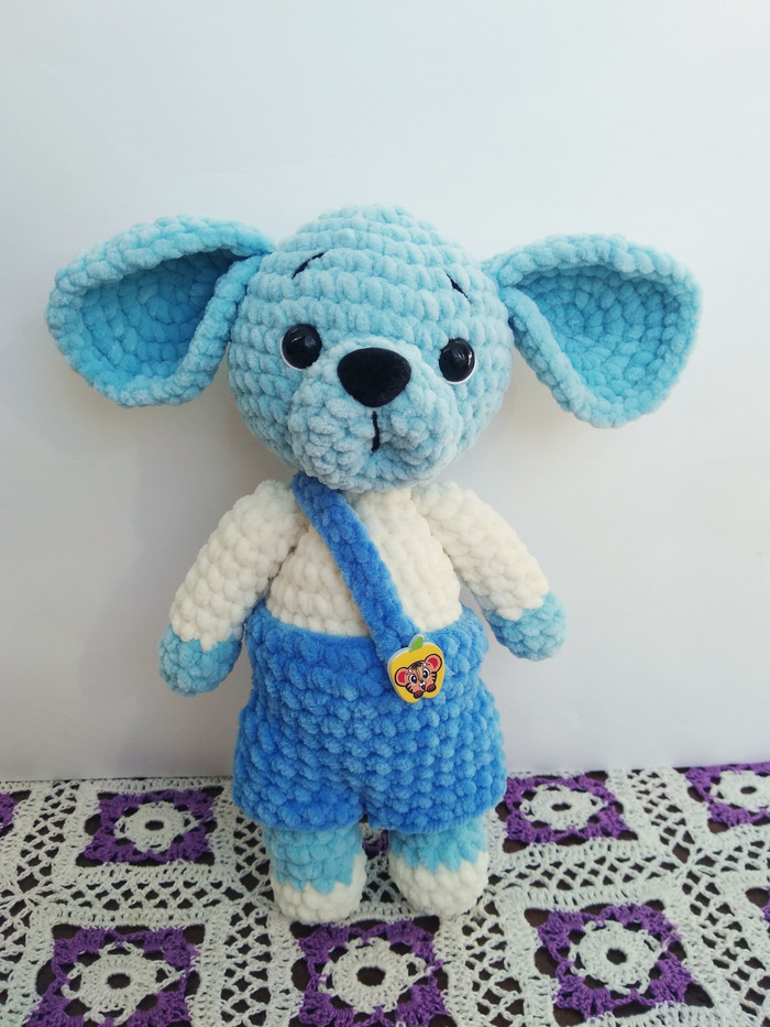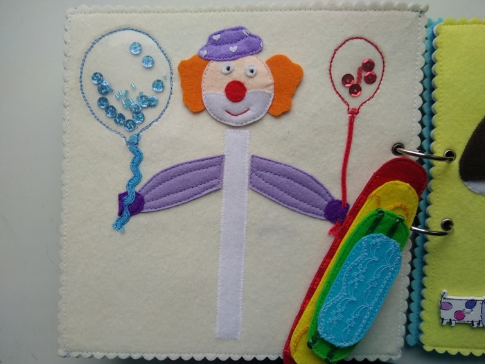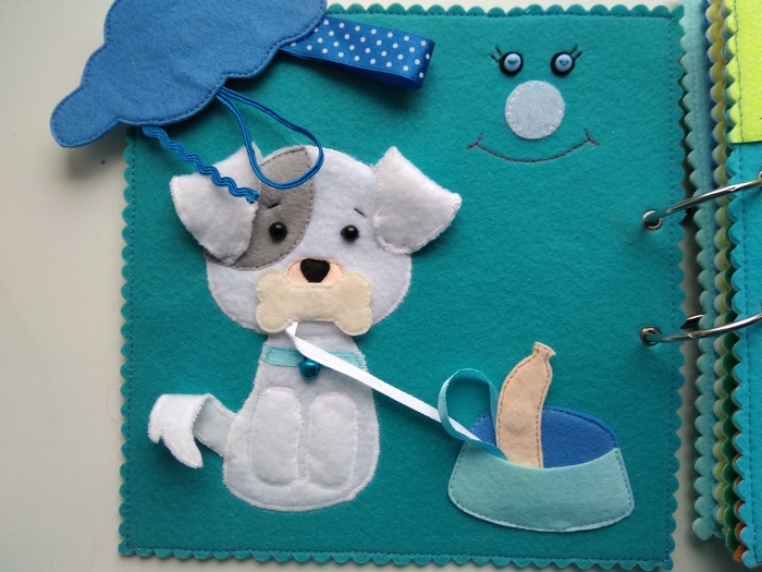 На первой странице флисовый пёсик с бубенчиком. Косточка и сосиска магнитятся ко рту, а тучка с сюрпризом.