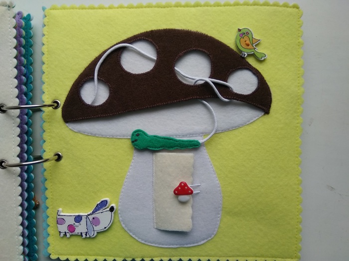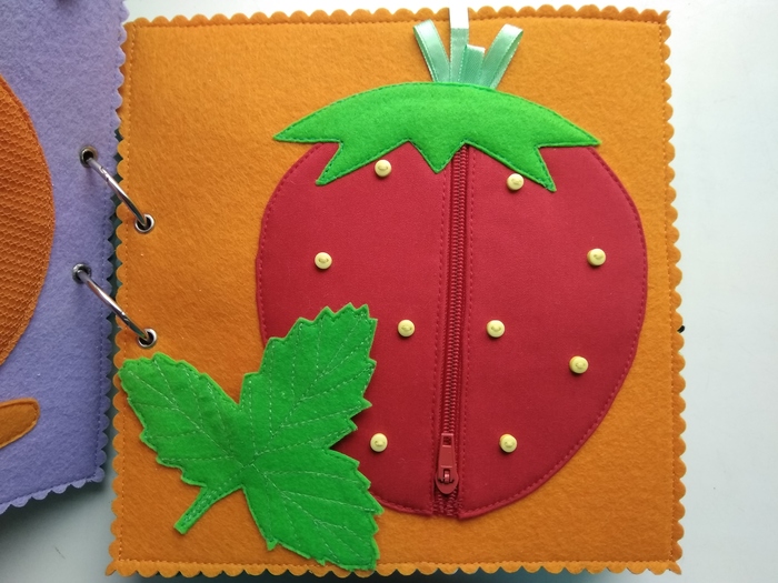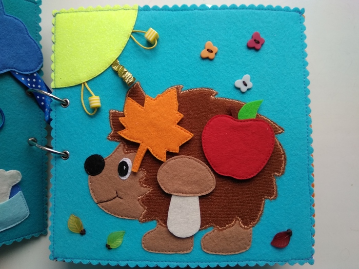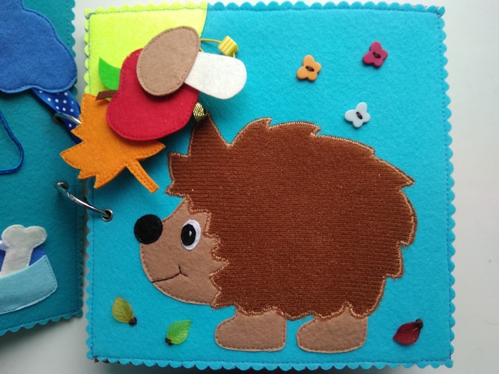 На второй странице разместился ёж из велкро ткани. Гриб, листок и яблоко крепятся к нему с помощью липучки. Солнце из блестящего фетра, лучики - резинки.
