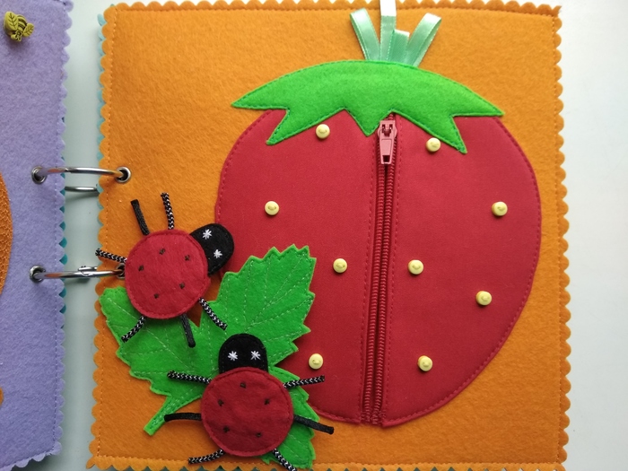 На четвёртой странице клубника с молнией, внутри которой живут 2 божьих коровки, и ещё одна под листочком.